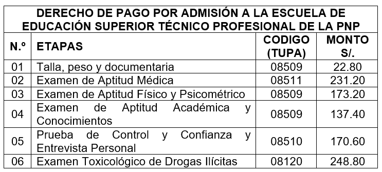 Se realiza por concepto de cuota de ingreso que comprende vestuario, equipos y materiales que son necesarios para el proceso de formación profesional policial, así como para garantizar que los estudiantes terminen el Plan de Estudios hasta su alta en la Policía Nacional del Perú.