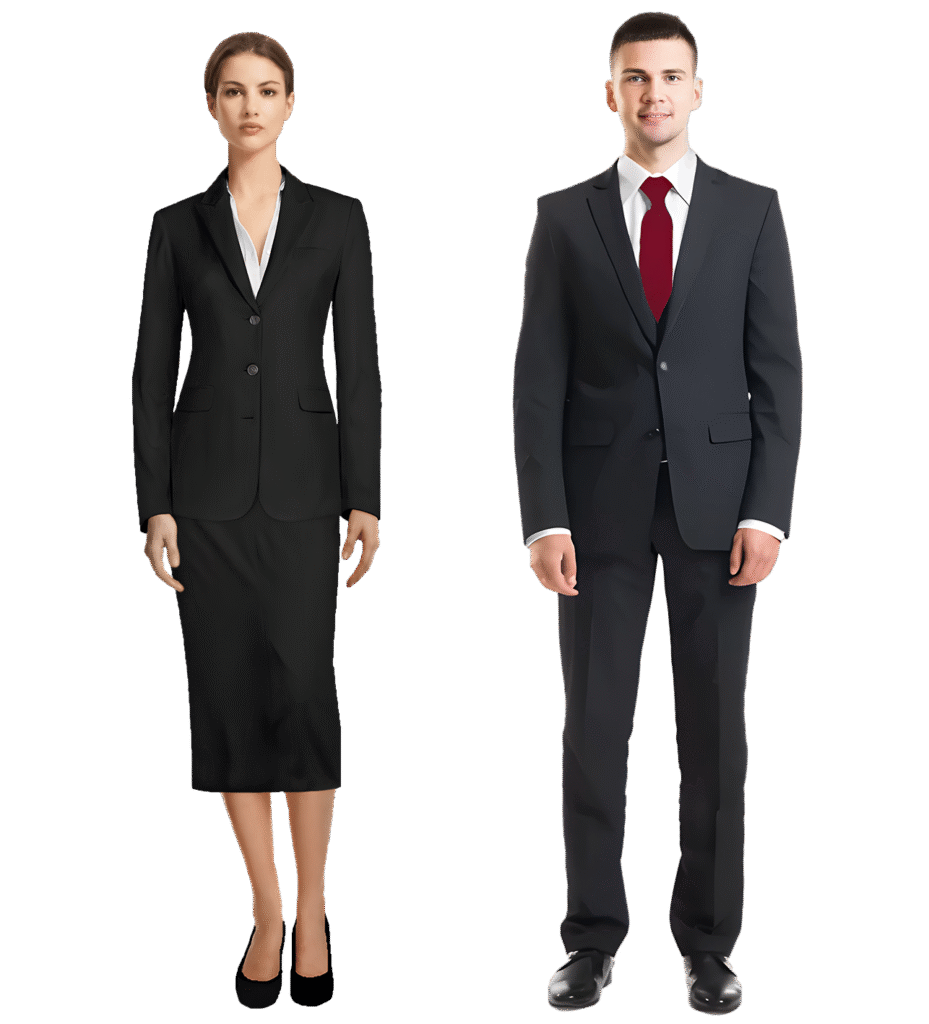 Femeninas con sastre color azul oscuro y/o negro, camisa blanca, cabello recogido sujetada con moñera de color negro.
